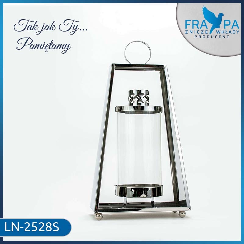 Geometryczna konstrukcja z metalu w połączeniu z przeszklonym wnętrzem tworzy harmonijną i stylową całość, która doskonale sprawdzi się zarówno jako dekoracja wnętrza, jak i element pamięci na cmentarzu.