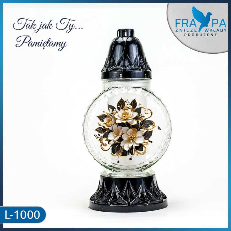 Połączenie przejrzystego szkła z subtelnymi złoto-czarnymi zdobieniami tworzy harmonijną kompozycję pełną stylu i delikatności. Ten elegancki znicz szklany z ozdobną naklejką doskonale sprawdzi się jako symbol pamięci, który łączy tradycję z nowoczesnym podejściem do estetyki..